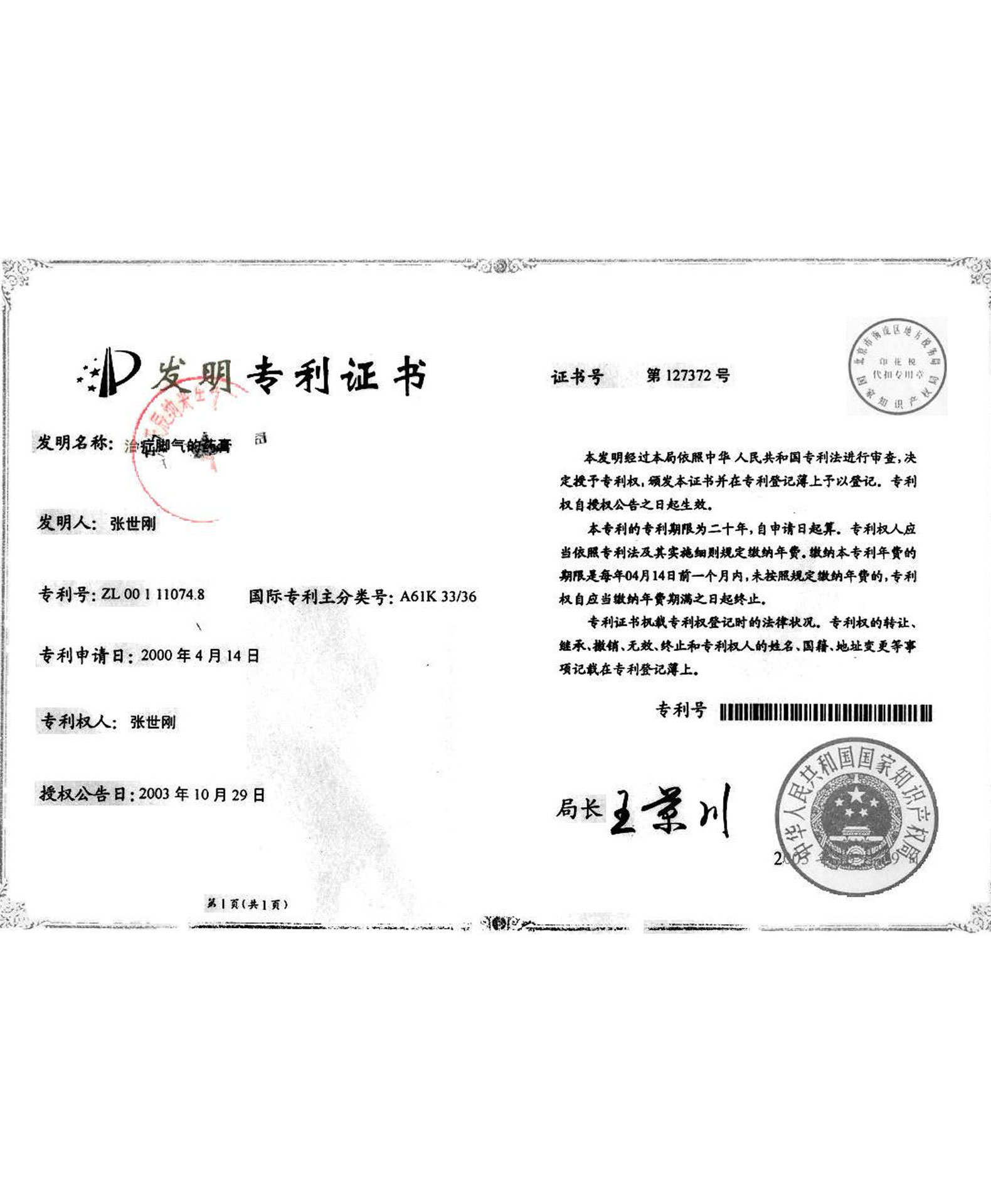 “治療腳氣藥膏”榮獲國(guó)家專(zhuān)利